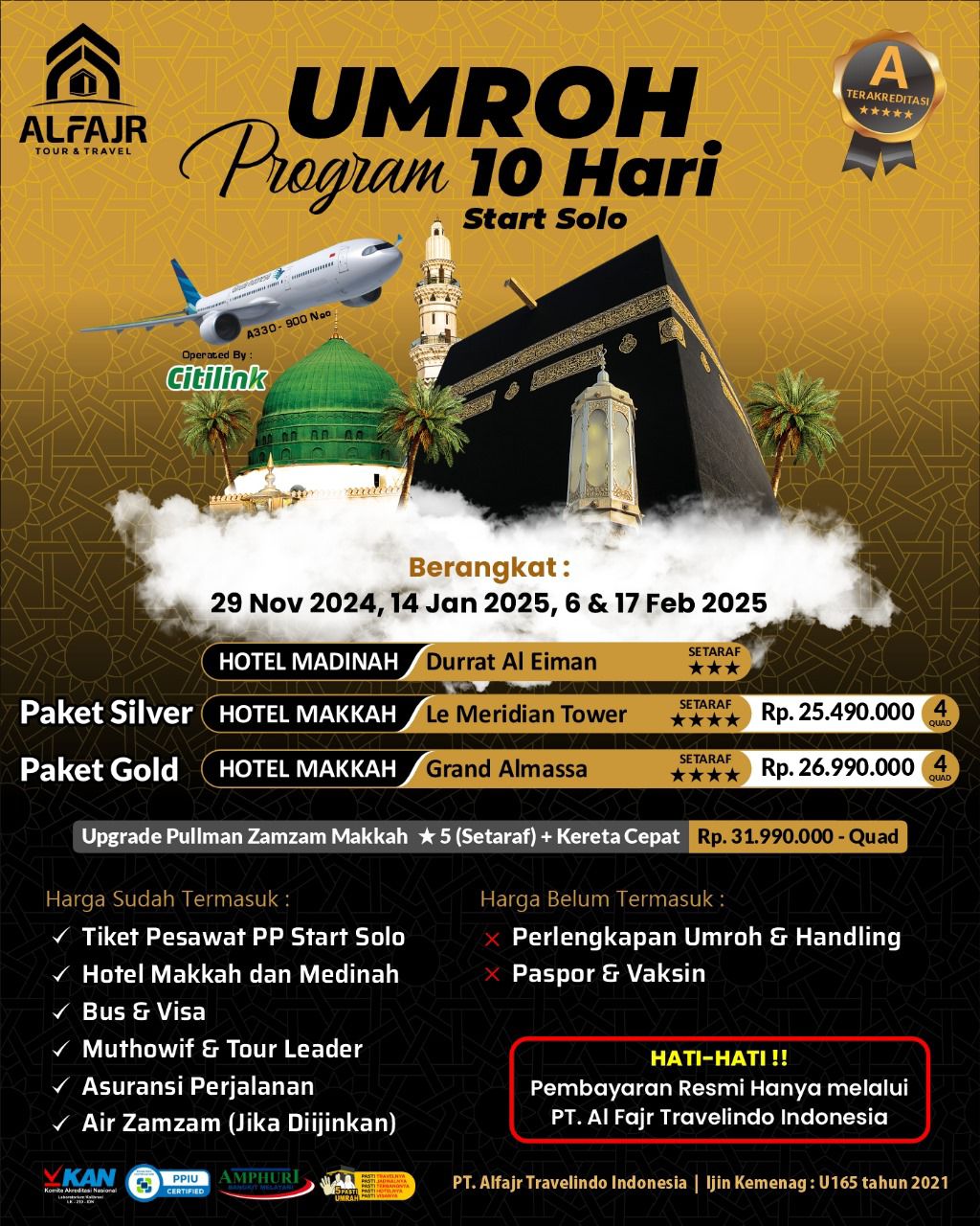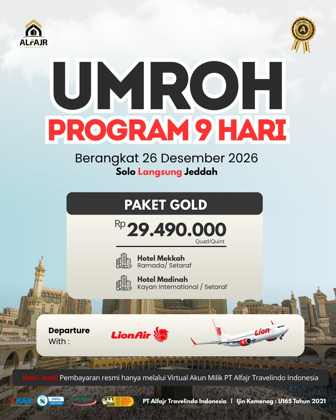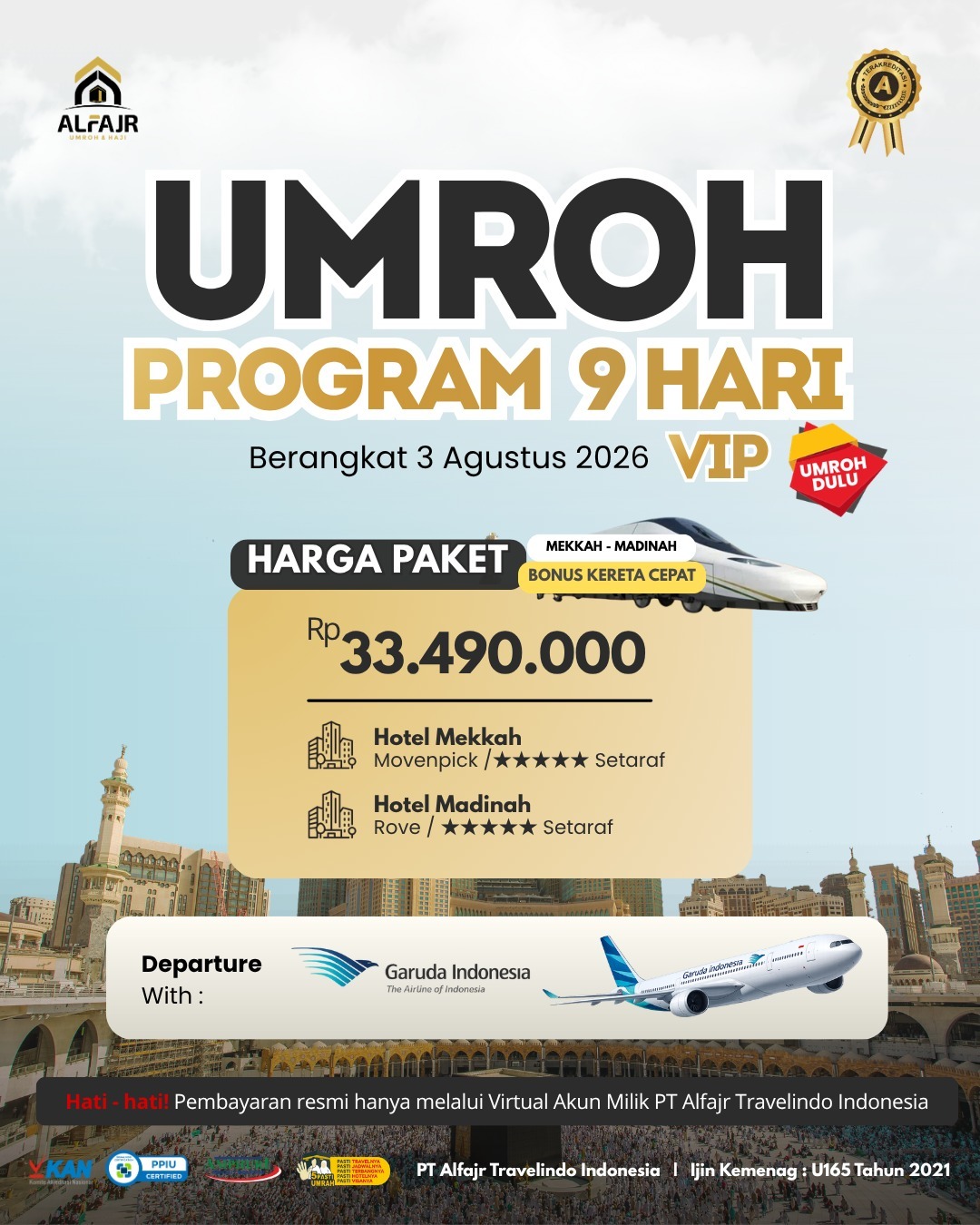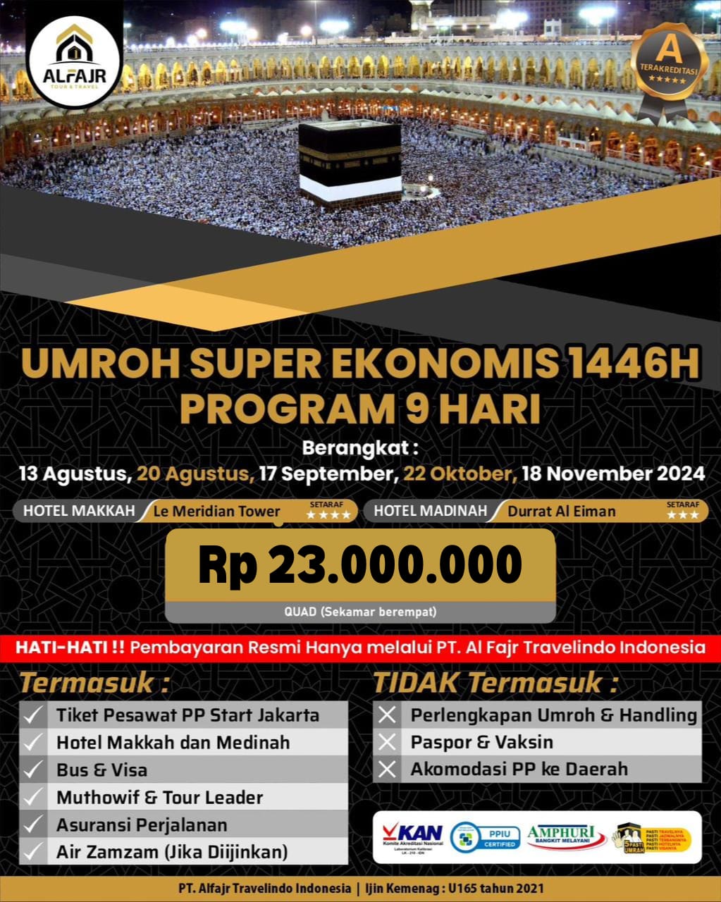 PT. ALFAJR TRAVELINDO INDONESIA yang berdiri sejak 2017 adalah perusahaan dengan segudang pengalaman dalam layanan umroh dan haji. Tak hanya sejarah sukses mereka dalam memberangkatkan ribuan jemaah, legalitas PT. ALFAJR TRAVELINDO INDONESIA juga tak perlu dipertanyakan. PT. ALFAJR TRAVELINDO INDONESIA mempunyai izin operasional sebagai Penyelenggara Perjalanan Ibadah Umroh (PPIU) dengan SK Menteri Agama RI No. U.165 Tahun 2021 tanggal 1 April 2021 dengan Akreditasi A dan SK Penyelenggara Ibadah Haji Khusus (PIHK) No. 02202006125370003 Tahun 2023 Tanggal 23-09-2023. (Bisa dicek di https://simpu.kemenag.go.id/ ).