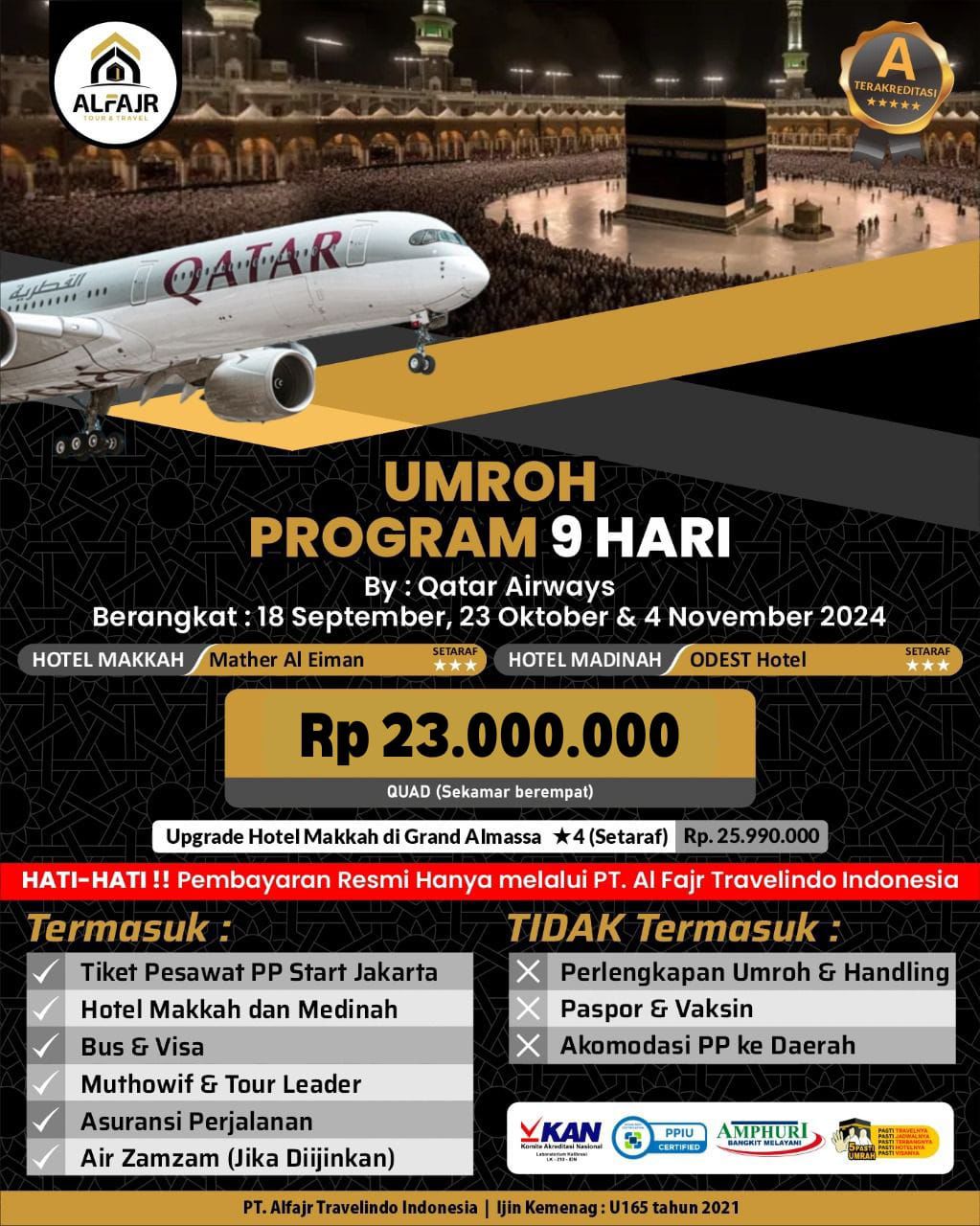 Saya sekeluarga berangkat umroh melalui Al Fajr, alhamdulillah lancar perjalanan dan ibadahnya, waktu itu ambil yg paket Malaysia Airline jadi berangkat dan pulang cukup dari YIA, Tour leader dan muthofif muda2 semua sehingga gercep. Sukses selalu Al Fajr🙏